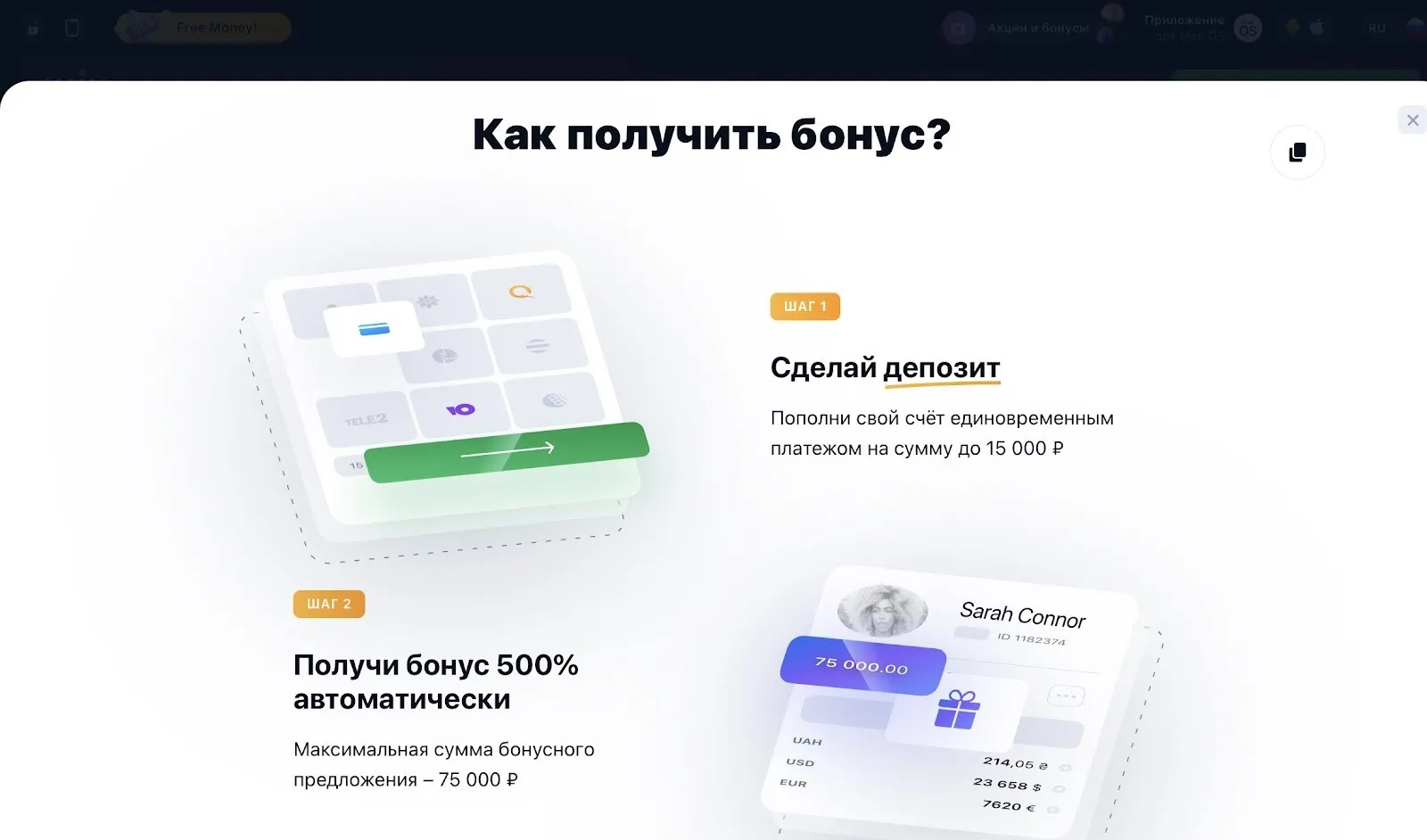 Для получения приветственного бонуса пользователю нужно пройти несколько шагов: